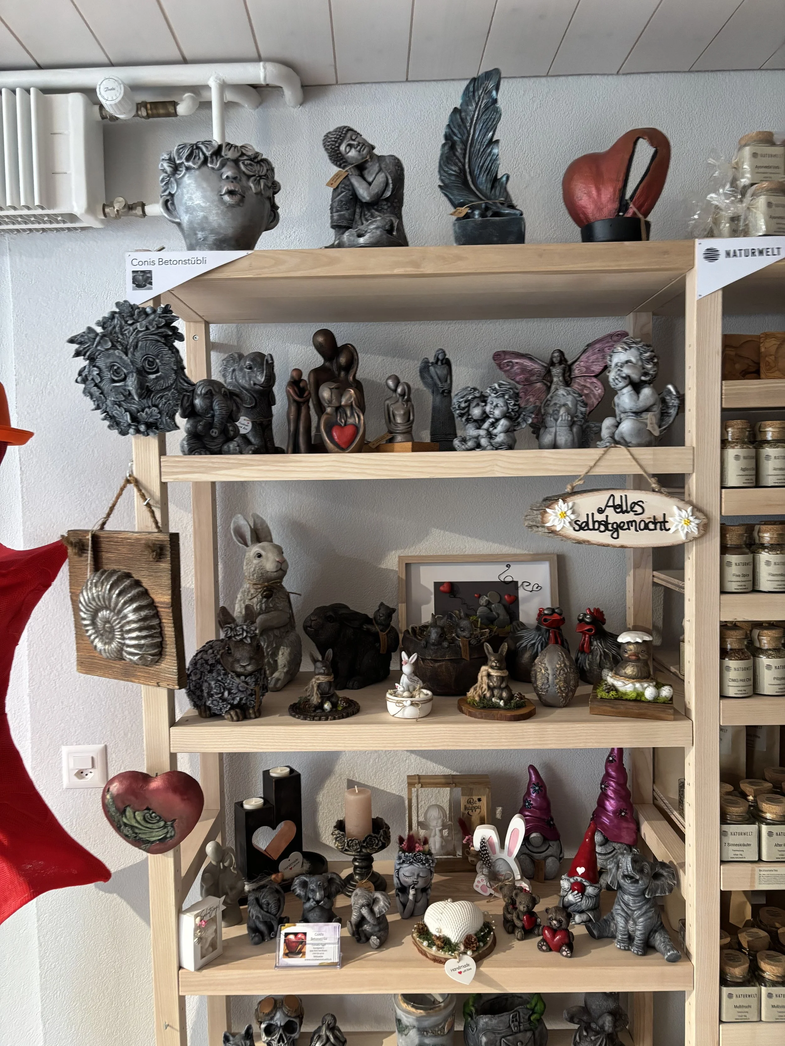 Neben meinem kleinen “Lädeli” zu Hause , das immer zugänglich ist, habe ich noch ein Verkaufsgestellt im Konsorzium, Hauptgasse 55, in Büren an der Aare. dort sind meine Betonkreationen zu Ladenöffnungszeiten auch immer ausgestellt.